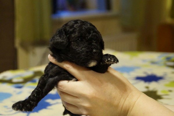 Finn, der kleinste des ganzen Wurfes. Er wird nur die Toygröße erreichen. In der Ahnenreihe beider Elterntiere sind Toys zu finden, deren Gene hier wieder zum Vorschein kommen. Finn ist der lebhafteste, ein richtiger Clown. Er bringt uns regelmäßig zum Lachen. Oft weckt er seine Geschwister indem er sie an Ohren und Beinen zieht, rennt und springt wie ein kleiner Wildfang. Angst kennt er keine. Er braucht eine Familie, die viel mit ihm unternehmen möchte und Spaß daran hat ihm etwas beizubringen.